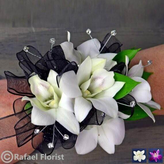 Deluxe: with 6 orchids, faux pearl cuff, and sparkling rhinestones. Approximately 4.5″ Wide x 6″ Long