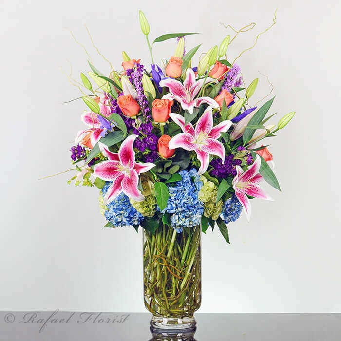 Premium: Larger design, larger container & even more blooms. Approximately 24″ W x 32″ H. Orientation: All-Around
